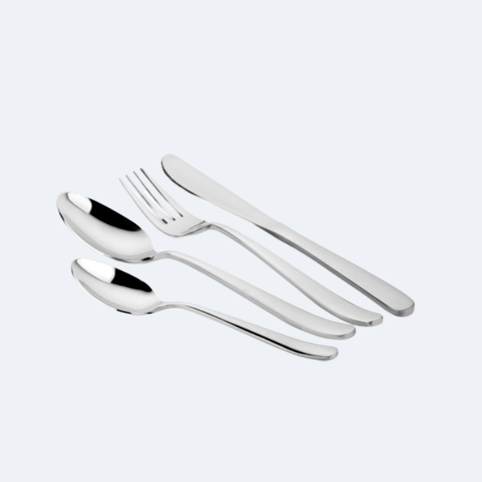 Includes: Dinner knives, forks, spoons, and teaspoons (customizable set sizes available).